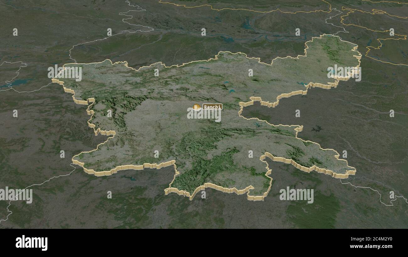 Zoom in on Jharkhand (state of India) extruded. Oblique